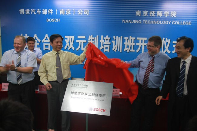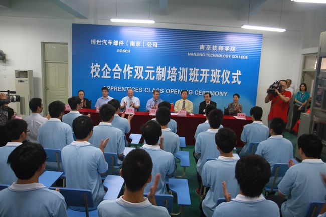 作为具有世界领先技术及服务的供应商,500强的德国企业博世公司,100多年来以其卓越的技术、产品和服务享誉世界,其学徒制(暨双元制)是有着悠久的历史和成熟的技能人才培养模式。此次校企双方进行的双元制冠名班合作,主要专业方向是机电一体化,三年学习期间,学生将在学校和博世公司培训中心交替进行一体化课程的学习,享受公司发放的生活补贴。德国工商会的职业教育专家将负责教学质量监督和考核。学生在取得学历和国家职业资格证书之余,还可获得德国专业技能(AHK)证书。合格毕业生将直接成为博世汽车部件(南京)公司技术工人,负责设备安装、维修和调试等工作,其中特别优秀的员工通过培训还有机会晋升到管理岗位。