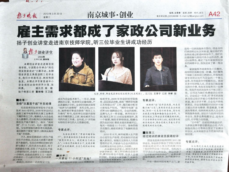 《扬子晚报》A42版—《雇主需求都成了家政公司新业务——扬子创业讲堂走进8868官方在线入口,听三位毕业生讲成功经历》
