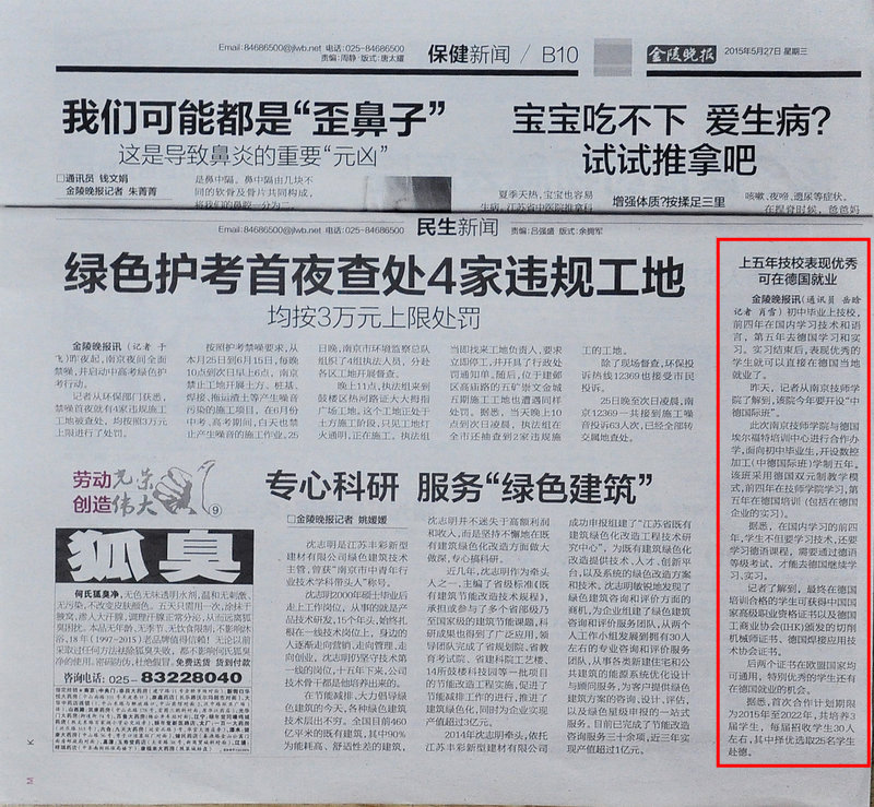 《金陵晚报》B10—上五年技校表现优秀可在德国就业