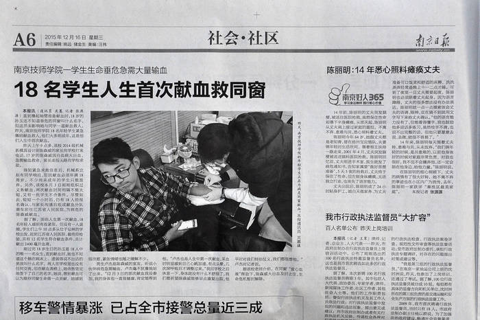 《南京日报》A6-18名学生人生首次献血救同窗