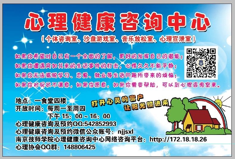 2016年5月暨“5· 25”大学生心理健康日,我校举行心理健康教育月活动。本次心理健康月的主题为“面与面的交流、心与心的沟通”,来自心理协会的学生们制作了“心理健康咨询中心”的标识牌分别展示在教学楼、食堂、宿舍等学生集中的地方,“广场心理咨询活动”、“放飞心灵--风筝代表我的心”、“心理情景剧”、“音乐放松沙龙”等一系列活动受到了老师、同学们的一致好评。