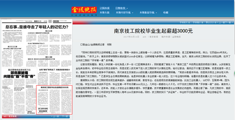 《金陵晚报》-A08 南京技工院校毕业生起薪超3000元