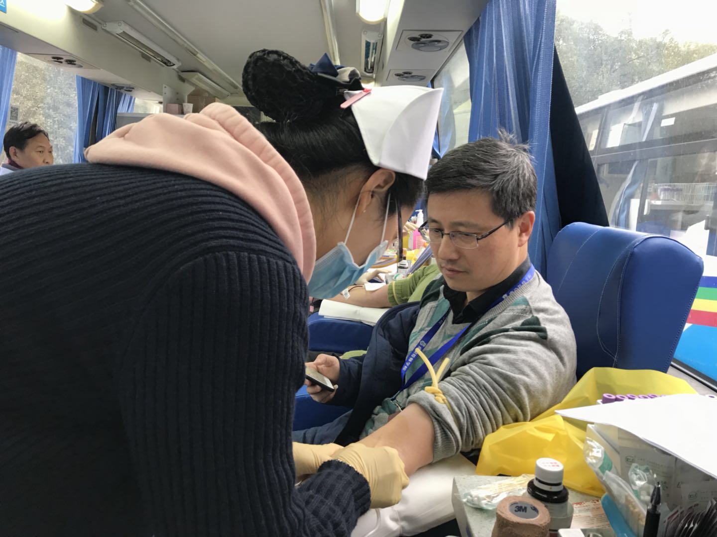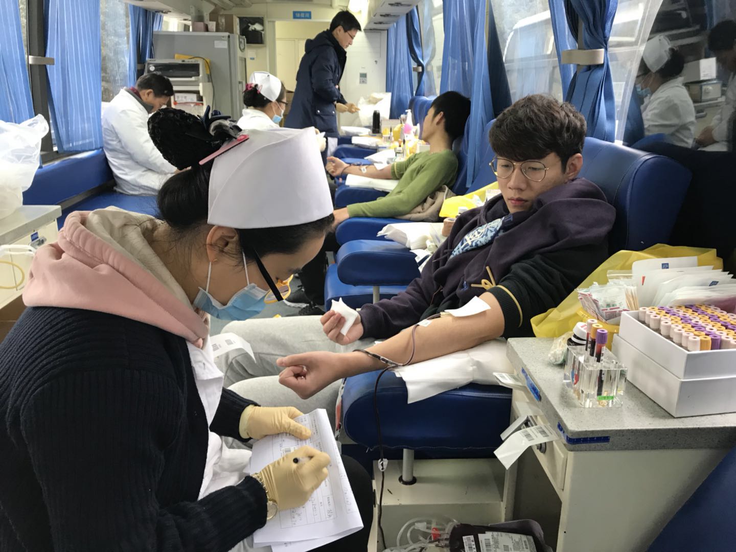 在献血活动现场,参与献血的教工按照医生的要求认真填写献血单、进行血样化验,并开始献血,一袋袋鲜红的热血流露着我教职员工高尚的道德情操和志愿服务精神,真体现了他们用血液凝聚爱心,用品行体现真情,以实际行动践行无私奉献的当代社会主义核心价值观。