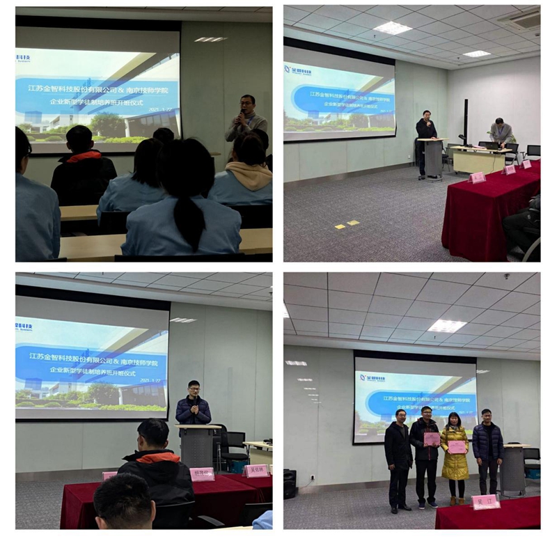 江苏金智科技股份有限公司制造中心副总经理胡茂俊、制造部经理吴江,8868官方在线入口电气工程系主任吴佑林,校企双方导师代表,部分新型学徒学员参加了本次开班仪式。