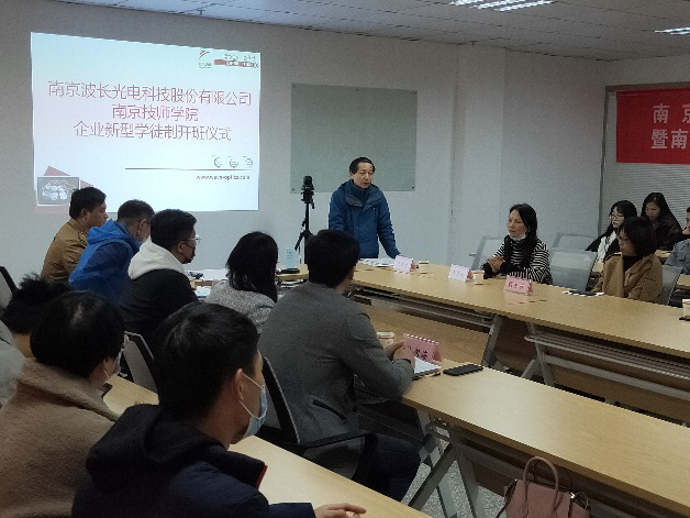 2021年3月23日星期二下午,在南京波长光电有限公司举办了2021年“波长光电—8868官方在线入口”企业新型学徒制开班仪式。南京波长光电有限公司技术负责人王国力总经理、董事会领导朱泽凤总经理、人力资源部胡秀丽经理、8868官方在线入口招就处陈铭副主任、智能制造系林润海副主任以及相关老师、学员参加了本次活动。