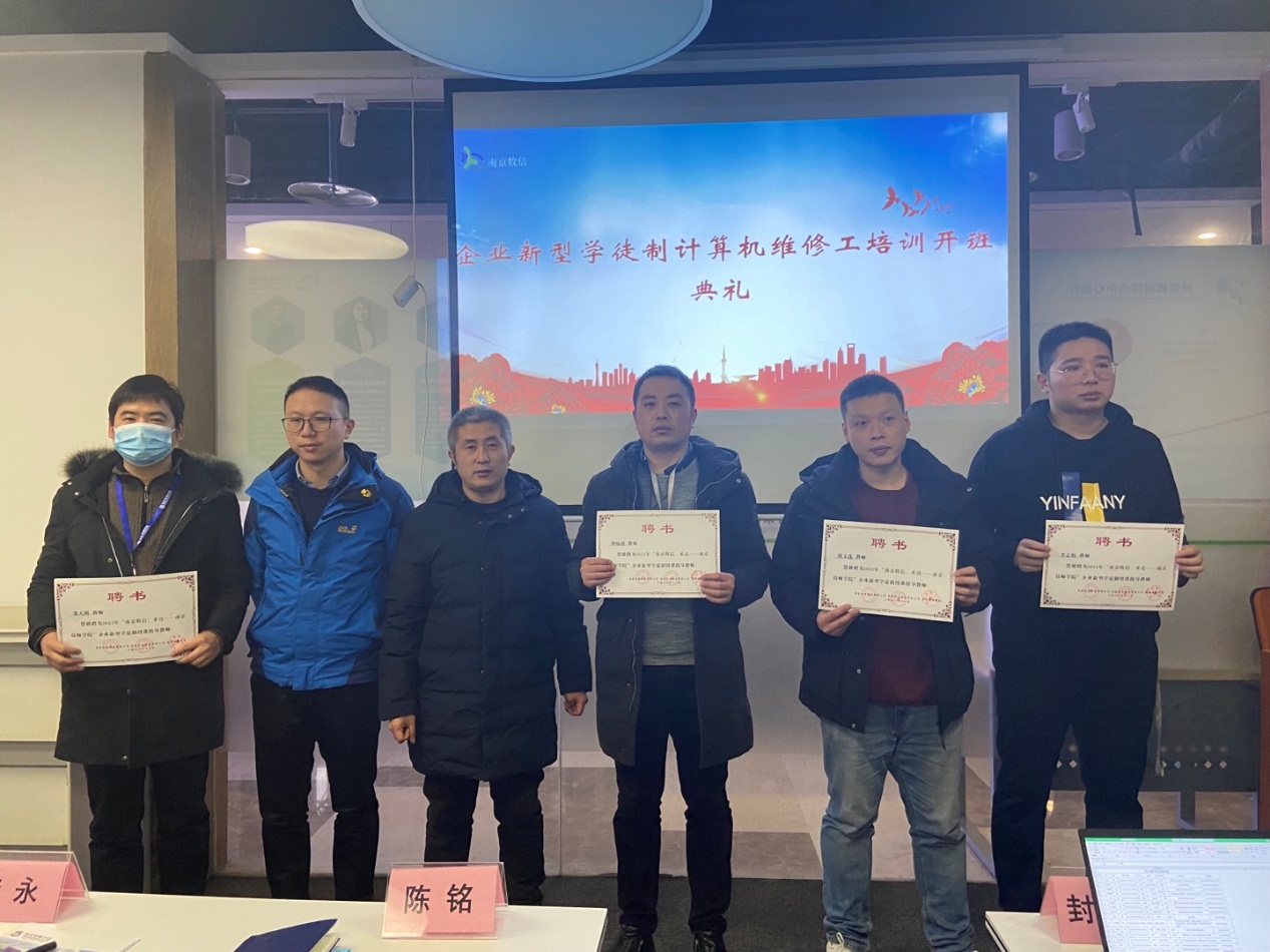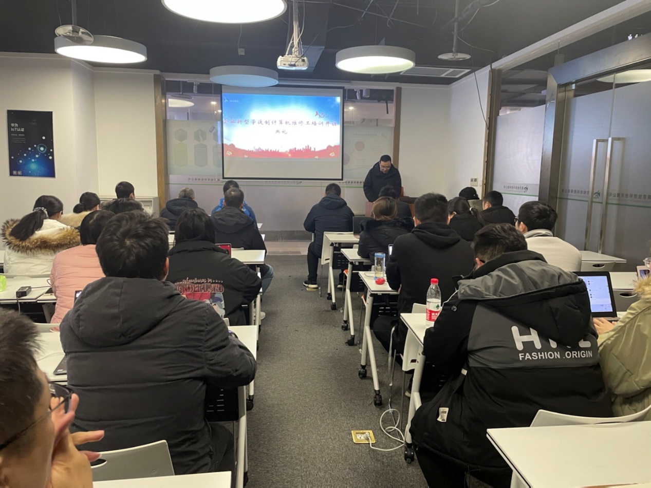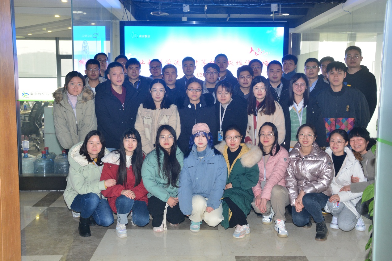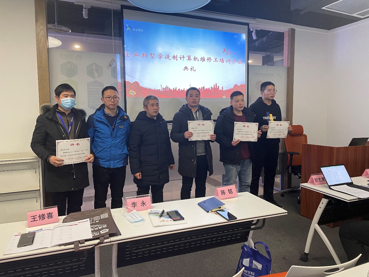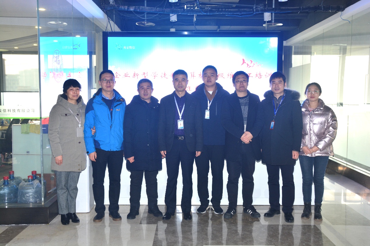 2022年1月11日,8868官方在线入口在南京牧信科技有限公司(南京禾达信息有限公司)举行了企业新型学徒制培训班的开班仪式。出席本次开班仪式的有牧信科技副总陆冬昀、经理沈碧英、技师学院招生就业处副主任陈铭、信息技术系副主任李永、教师代表王修喜和班主任蔡敏等。两家企业属关联公司在同层办公,因此开班后将采取合班授课形式,一共40名学员参与培训。