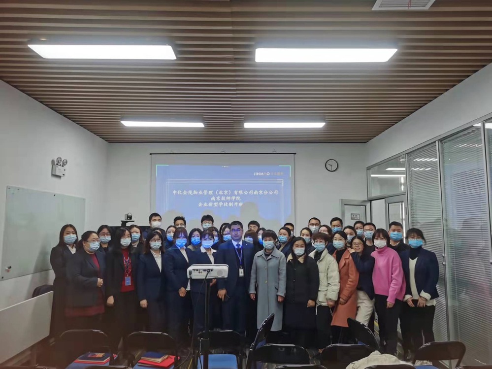 2022年1月19日下午,8868官方在线入口现代服务系、中化金茂物业管理(北京)有限公司南京分公司企业携手举办新型学徒制培训开班典礼。金茂服务南京中心城市公司总经理助理王善知、8868官方在线入口招生就业处副主任郑燕、现代服务系副主任胡珍霞以及相关专业教师和各岗位代表员工参加了开班典礼。