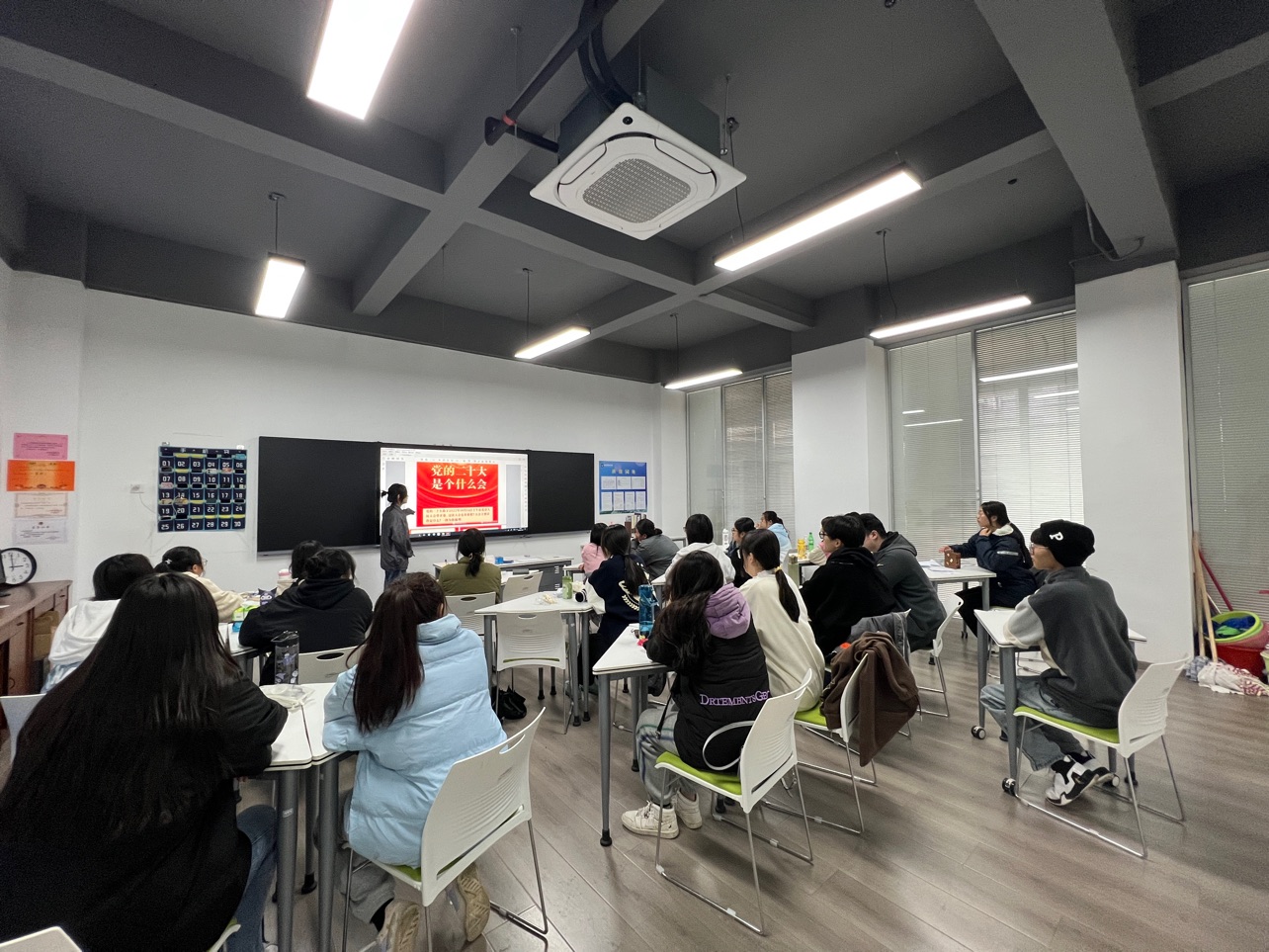 同时学生复述了党的二十大主题:高举中国特色社会主义伟大旗帜,全面贯彻习近平新时代中国特色社会主义思想,弘扬伟大建党精神,自信自强、守正创新,踔厉奋发、勇毅前行,为全面建设社会主义现代化国家,全面建设社会主义现代化国家、全面推进中华民族伟大复兴而团结奋斗。