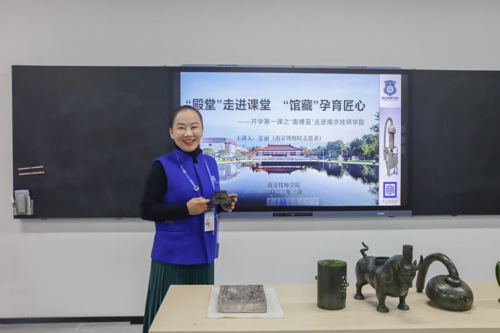 为全面贯彻党的二十大精神,弘扬中华优秀传统文化,让学生了解历史知识、体悟工匠精神、增强劳动意识、厚植家国情怀,2023年3月22日上午8868官方在线入口“开学第一课”系列活动之文博专家进校园以“殿堂走进课堂,馆藏孕育匠心”为主题,邀请了南京博物院文物专家张丽老师作为开讲嘉宾,通过深度解读国宝级文物“错银饰青铜牛灯”等镇馆之宝,为学院师生开展了一堂别开生面、理论与实践相结合的公开课。