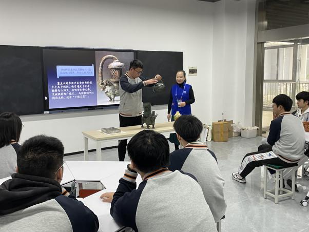 张丽老师通过介绍展示距今8000-5000年的新石器时代陶器、釜灶、彩陶砵、错银铜牛灯等文物照片,深深吸引了现场学生的注意力,学生们在惊叹古人劳动智慧的同时,也被文物“如切如磋,如琢如磨”的工艺细节中折射出的工匠精神深深折服。