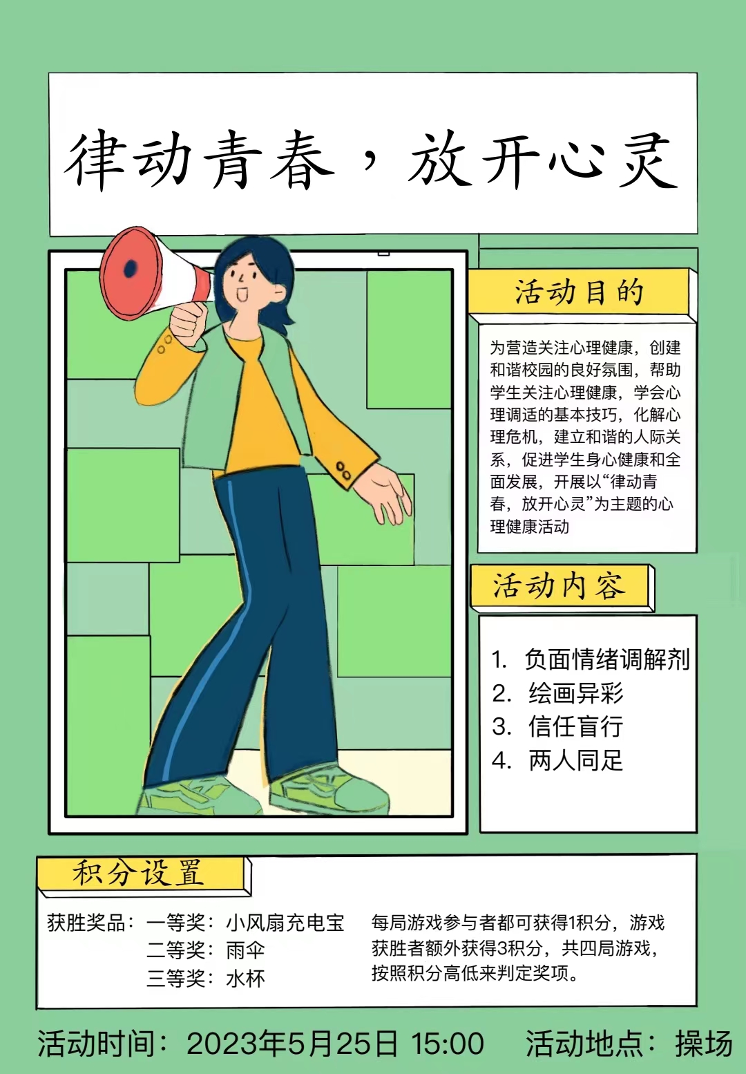 5月25日下午,由心理协会牵头,社团联合会与团工部积极配合,在操场举行了心理健康广场活动,活动内容包括“负面情绪调解剂”“绘画异彩”“信任盲行”“两人同足”,同学们积极参与其中。彼此之间陌生的同学在游戏的过程中逐渐变得默契,操场上洋溢着欢声笑语,这些游戏在丰富同学们课余的同时,也促进了彼此之间的沟通,有助于培养个人的团队精神以及合作精神。