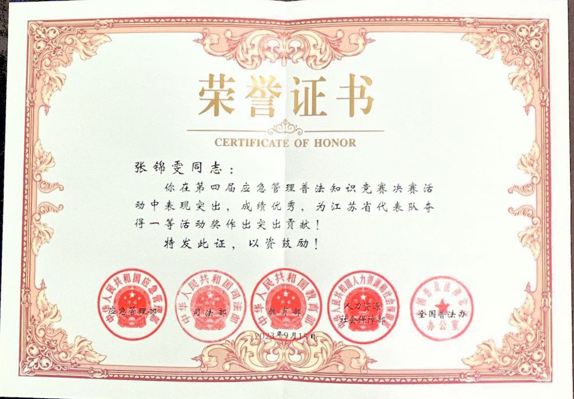 为全面贯彻落实党的二十大精神,深入学习宣传习近平法治思想,按照全国“八五”普法规划和全国应急管理系统“八五”普法工作部署,由应急管理部、司法部、教育部、人力资源社会保障部、全国普法办共同组织开展的第四届应急管理普法知识竞赛活动决赛结果公布。江苏省代表队获得“一等活动奖”,8868官方在线入口获得“优秀组织单位”荣誉,学院2020级机电(高中技师)班张锦雯同学作为江苏省代表队成员,在决赛活动中表现突出,助力江苏省夺得“一等活动奖”。