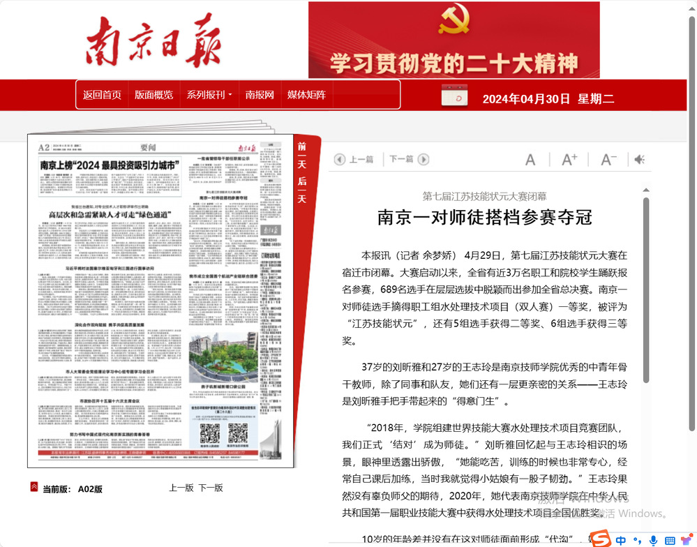 《南京日报》A2版——8868官方在线入口一对师徒选手摘得第七届江苏技能状元大赛职工组水处理技术项目(双人赛)一等奖