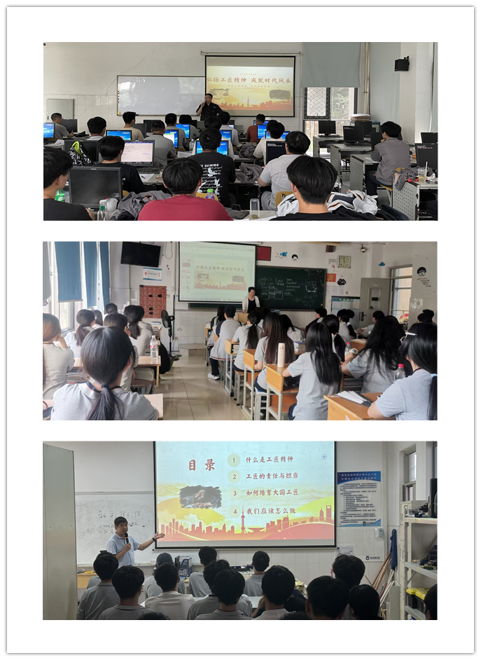 随后,各班级围绕“弘扬工匠精神成就时代风采”主题开展班会。班会上,老师们通过生动案例,详细阐释了工匠精神“执着专注、精益求精、一丝不苟、追求卓越”的内涵,强调工匠精神是从业者对职业的敬畏热爱、对产品的精雕细琢、对技术的不断钻研。